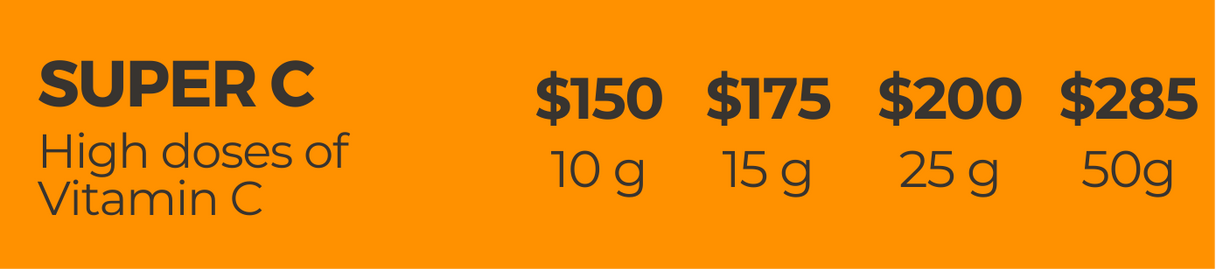 Elevate your health with our Super C Drip, offering 10g, 15g, 25g, or 50g doses of Vitamin C. This drip is designed to aid in eliminating toxins, combating free radicals, and providing advanced immune support. Ideal for those seeking a significant boost in their immune system.